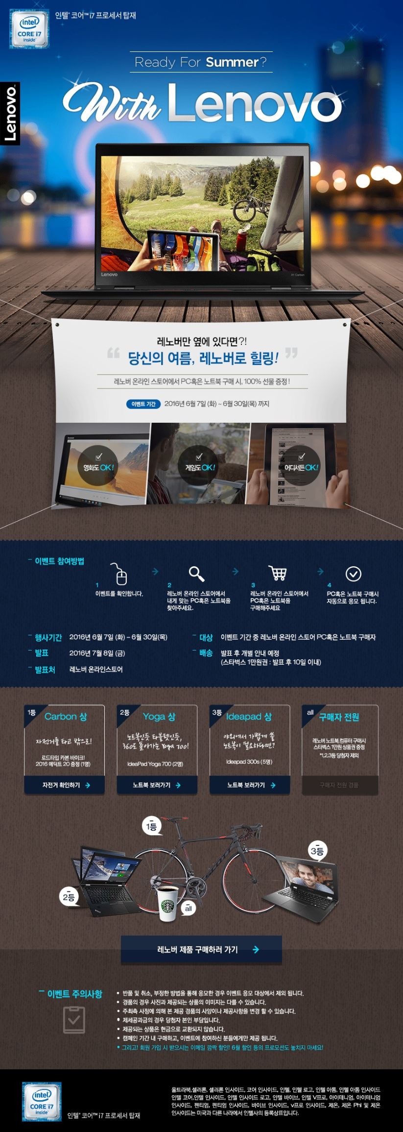 [아시아경제 김유리 기자] 한국레노버가 여름 시즌을 맞이해 오는 30일까지 노트북 구매 고객을 대상으로 '프리 썸머 노트북 페스티벌' 사은 이벤트를 진행 중이라고 21일 밝혔다. 한국레노버는 '이번 여름은 레노버와 함께!'라는 슬로건과 함께 진행되는 이번 이벤트로 레노버 온라인 스토어에서 노트북을 구매하는 고객에게 추첨을 통해 다양한 사은품을 증정한다. 한국레노버는 온라인스토어 구매 고객 전원에게 스타벅스 1만원 상당의 상품권을 증정하고, 추첨을 통해 1등에게는 프리미엄 카본 자전거인 '2016 에딕트 20'을, 2등과 3등에게는 '아이디어패드 요가 700' '아이디어패드 300s'를 각각 제공한다. 이벤트 참여 방법은 레노버 온라인 스토어에서 제품을 구매하면 자동으로 응모되며, 당첨자는 다음 달 8일 레노버 홈페이지에서 확인할 수 있다.이번 행사는 레노버 온라인 스토어에서 판매되는 노트북 제품을 대상으로 진행되며 제품에 따라 최대 15%의 할인 혜택을 제공한다. 세계에서 가장 얇은 비즈니스 울트라북으로 주요 기업들의 임원 및 최고경영자(CEO)들이 사용해 더 유명해진 '씽크패드 X1 카본'을 비롯해, 고성능 게이밍 노트북 '아이디어패드 Y700', 경제적인 가격의 세련된 노트북 '아이디어패드 100' 및 '아이디어패드 300' 등이 포함된다. 강용남 한국레노버 대표는 "여름 시즌을 앞두고 고객들에게 보다 다양한 혜택을 제공하고자 이번 이벤트를 기획했다"며 "레노버는 전 세계 1위 PC 기업으로서 가장 다양하고 세분화된 PC 포트폴리오와 풍성한 이벤트로 고객 만족을 위해 끊임없이 노력할 것"이라고 말했다. 자세한 내용은 행사 홈페이지 를 통해 확인할 수 있다.김유리 기자 yr61@asiae.co.kr<ⓒ세계를 보는 창 경제를 보는 눈, 아시아경제(www.asiae.co.kr) 무단전재 배포금지>
