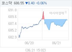 2016년 06월 21일 코스닥 지수는 0.40p (0.06%) 하락한 688.55로 마감했습니다.금일 (2시40분 기준) 코스닥 주요 상승 종목은 버추얼텍,오리엔트정공,나노캠텍이며, 코스닥 주요 하락 종목은 갑을메탈,이트론,엘컴텍입니다.아경봇 기자 r2@asiae.co.kr<ⓒ세계를 보는 창 경제를 보는 눈, 아시아경제(www.asiae.co.kr) 무단전재 배포금지>