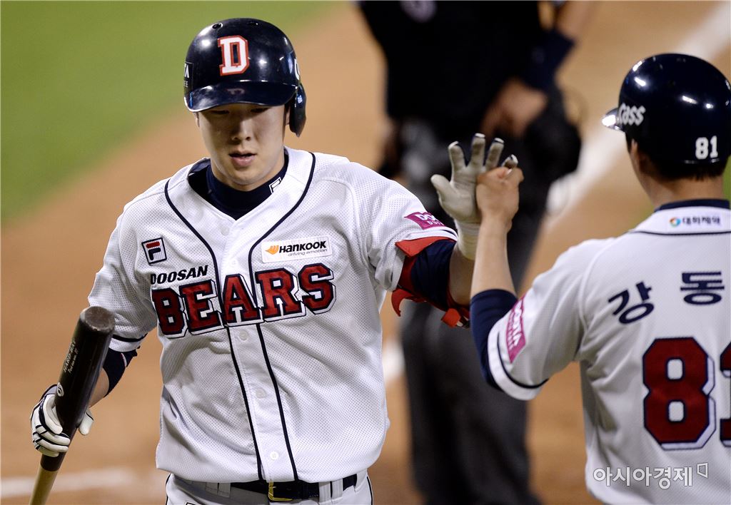 [아시아경제 김현민 기자] 프로야구 kt 위즈와 두산 베어스의 2016 KBO리그 경기가 21일 잠실구장에서 열렸다. 5회말 두산 선두타자 박건우가 kt 이상화를 상대로 좌월 추가 솔로 홈런을 치고 강동우 코치와 하이파이브하고 있다. 김현민 기자 kimhyun81@asiae.co.kr<ⓒ세계를 보는 창 경제를 보는 눈, 아시아경제(www.asiae.co.kr) 무단전재 배포금지>