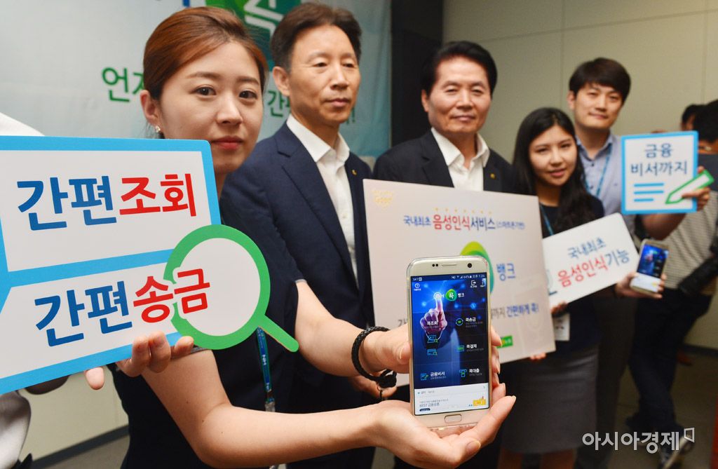 [아시아경제 문호남 인턴기자] 김병원 농협중앙회 회장(오른쪽 세번째)과 직원들이 22일 서울 중구 농협중앙회에서 NH콕(CoK) 뱅크를 선보이고 있다. NH콕 뱅크는 음성인식 기능을 탑재했으며 공인인증서나 OTP없이 핀번호만으로 계좌조회와 송금, 결제 서비스를 이용할 수 있다.문호남 인턴기자 munonam@asiae.co.kr<ⓒ세계를 보는 창 경제를 보는 눈, 아시아경제(www.asiae.co.kr) 무단전재 배포금지>