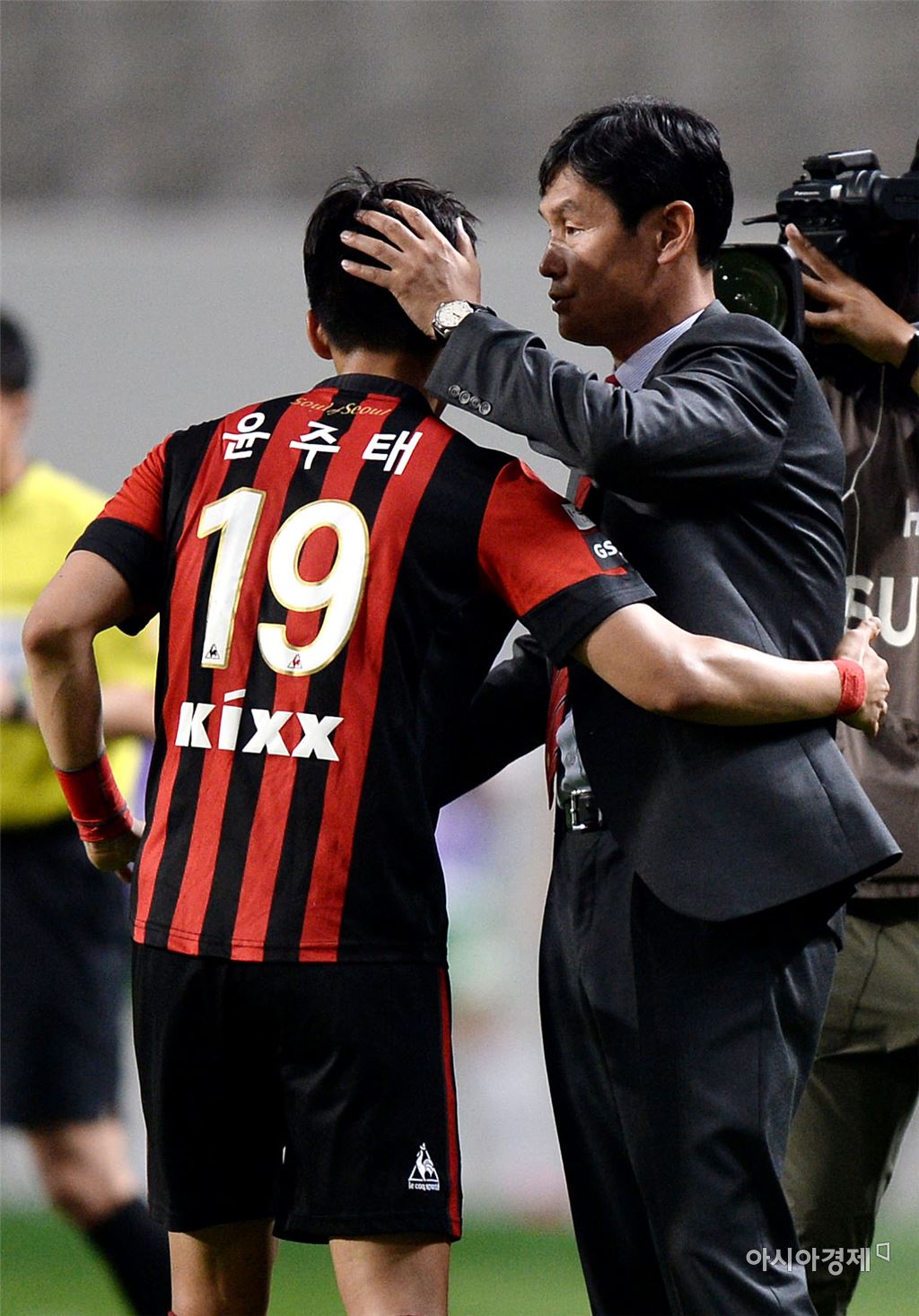 [아시아경제 김현민 기자] 프로축구 FC 서울과 안산 무궁화의 2016 FA컵 16강전이 22일 서울월드컵경기장장에서 열렸다. 후반 서울 윤주태가 2-0 추가골을 넣고 최용수 감독과 기쁨을 나누고 있다. 김현민 기자 kimhyun81@asiae.co.kr<ⓒ세계를 보는 창 경제를 보는 눈, 아시아경제(www.asiae.co.kr) 무단전재 배포금지>
