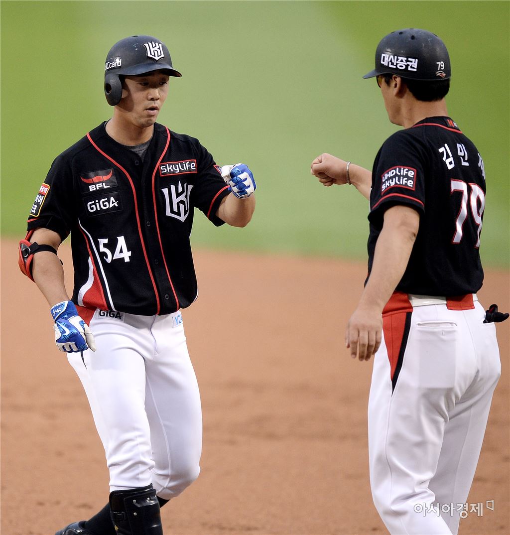 [아시아경제 김현민 기자]프로야구 kt 위즈와 두산 베어스의 2016 KBO리그 경기가 23일 잠실구장에서 열렸다. 2회초 1사 1루에서 kt 전민수가 좌전 안타를 치고 출루한 뒤 김민재 코치와 하이파이브하고 있다. 김현민 기자 kimhyun81@asiae.co.kr<ⓒ세계를 보는 창 경제를 보는 눈, 아시아경제(www.asiae.co.kr) 무단전재 배포금지>