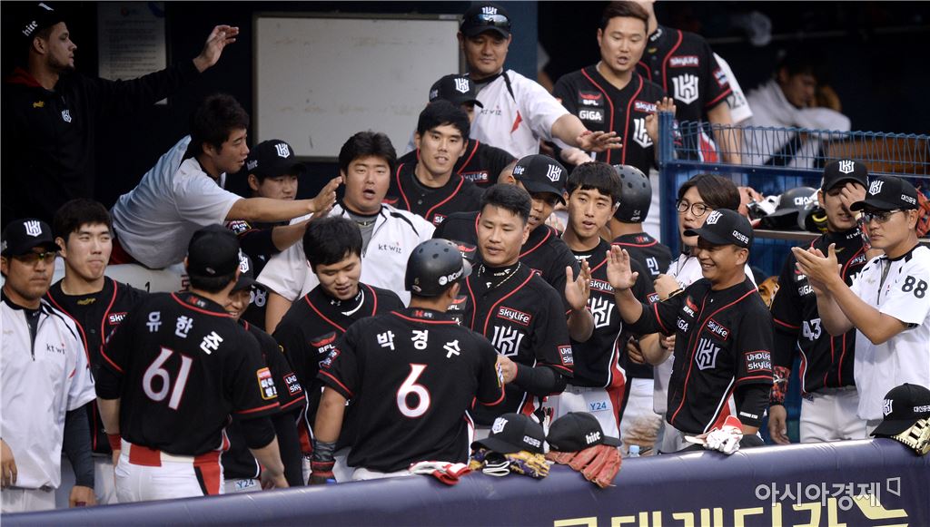 [아시아경제 김현민 기자]프로야구 kt 위즈와 두산 베어스의 2016 KBO리그 경기가 23일 잠실구장에서 열렸다. 2회초 1사 만루에서 kt 박기혁의 선취 2타점 적시타 때 득점을 올린 kt 박경수가 동료들의 환영을 받고 있다. 김현민 기자 kimhyun81@asiae.co.kr<ⓒ세계를 보는 창 경제를 보는 눈, 아시아경제(www.asiae.co.kr) 무단전재 배포금지>