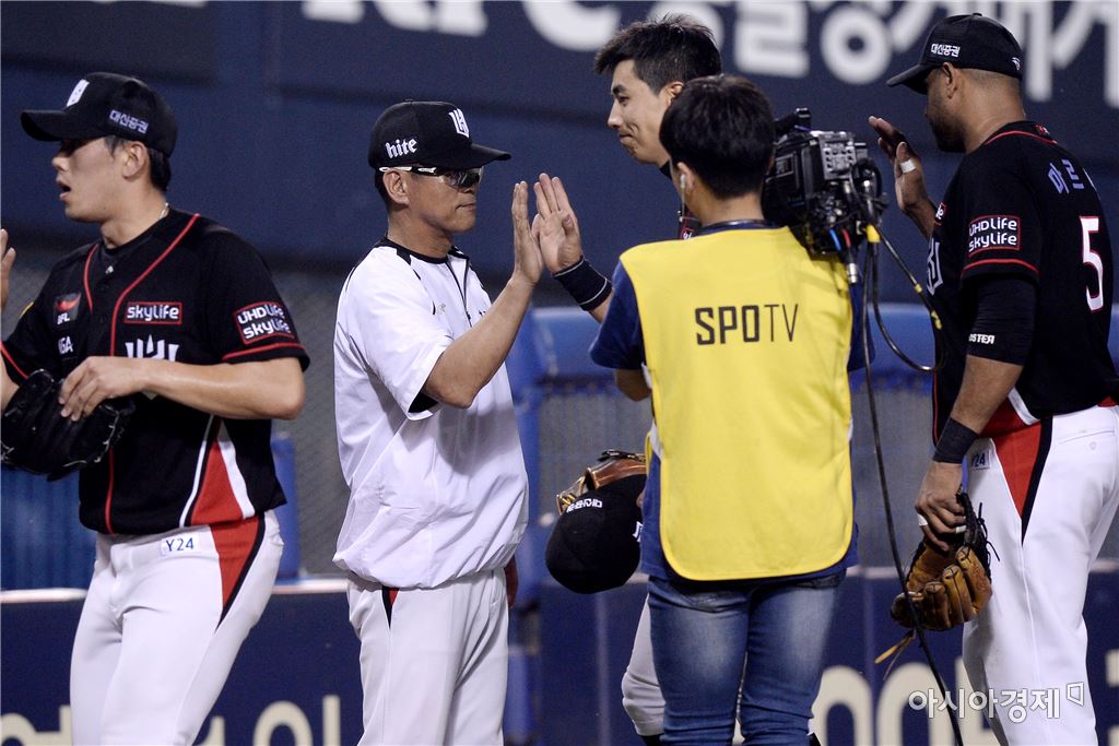 [아시아경제 김현민 기자]프로야구 kt 위즈와 두산 베어스의 2016 KBO리그 경기가 23일 잠실구장에서 열렸다. kt 조범현 감독이 9-4 승리를 확정한 뒤 선수들과 하이파이브하고 있다.김현민 기자 kimhyun81@asiae.co.kr<ⓒ세계를 보는 창 경제를 보는 눈, 아시아경제(www.asiae.co.kr) 무단전재 배포금지>