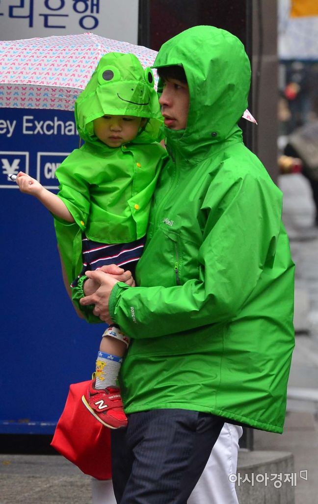 [아시아경제 백소아 기자] 전국 대부분 지역에 비가 내리고 있는 24일 서울 중구 명동거리에 초록색 개구리 우비를 입은 아이가 아빠의 품에 안겨 있다.백소아 기자 sharp2046@asiae.co.kr<ⓒ세계를 보는 창 경제를 보는 눈, 아시아경제(www.asiae.co.kr) 무단전재 배포금지>