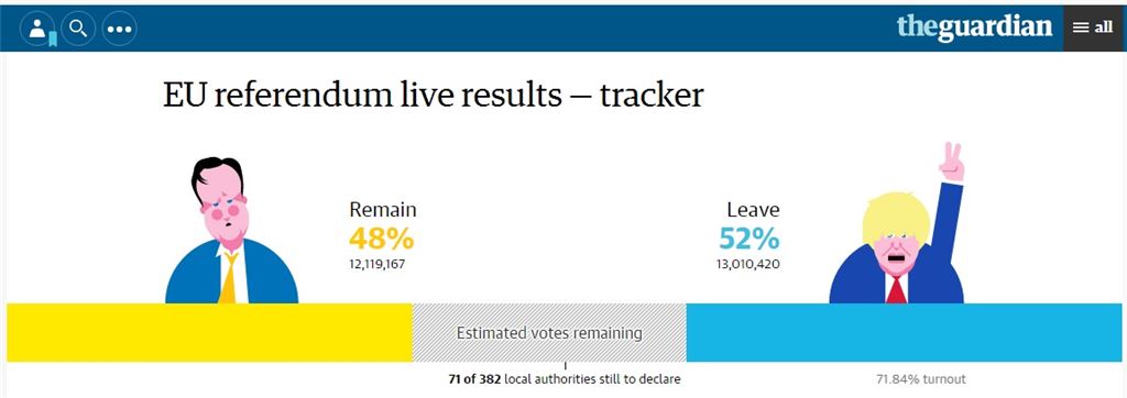 국민 투표 결과가 영국의 EU탈퇴로 기울자 영국 일간 가디언은 홈페이지에 웃고있는 보리스 존슨 전 런던시장과 당황한 모습의 데이비드 캐머런 영국 총리의 캐리커처를 올렸다. 존슨은 EU 탈퇴파이다.(캡처=가디언홈페이지)