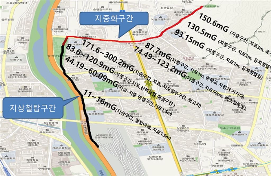 ▲ 의정부-상계 고압송전선로(154KV) 지중화 구간 전자파 측정결과 <br /> 측정시기 : 2014년 8월~10월, 측정기기 : TENMARS / EMDEX2 (제공=유청의원)