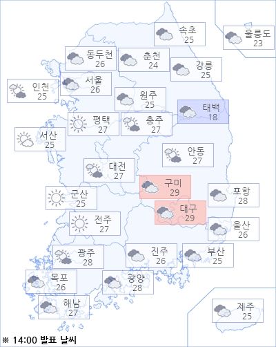 현재 기온이 가장 낮은 곳은 태백으로 영상 18도이며, 구미는 영상 29도로 가장 높은 기온을 기록하고 있고, 아침 최저기온은 영상 16도에서 영상 21도, 낮 최고기온은 영상 24도에서 영상 31도가 되겠습니다.미세먼지 농도: 오후 대전·강원·충남·제주 지방은 ‘보통’ 입니다.※ 미세먼지 자료는 인증되지 않은 실시간 자료이므로 오차가 발생할수 있음.아경봇 기자 r2@asiae.co.kr<ⓒ세계를 보는 창 경제를 보는 눈, 아시아경제(www.asiae.co.kr) 무단전재 배포금지>