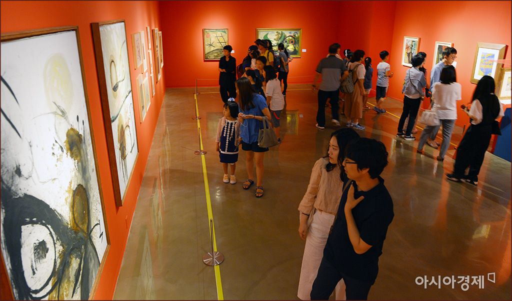 [아시아경제 윤동주 기자] 아시아경제 주최로 26일 서울 종로구 세종문화회관 미술관에서 개막한 '꿈을 그린 화가 호안 미로 특별전'을 찾은 관람객들이 작품을 둘려보고 있다. 호안 미로(Joan Miro, 1893~1983)’는 야수주의, 입체주의, 그리고 초현실주의에서 다양한 요소들을 받아들여 자신만의 개성 있는 양식을 만들어낸 화가로 스페인에서 가장 존경받는 화가로 이번 전시는 9월 24일까지 개최된다.윤동주 기자 doso7@asiae.co.kr<ⓒ세계를 보는 창 경제를 보는 눈, 아시아경제(www.asiae.co.kr) 무단전재 배포금지>