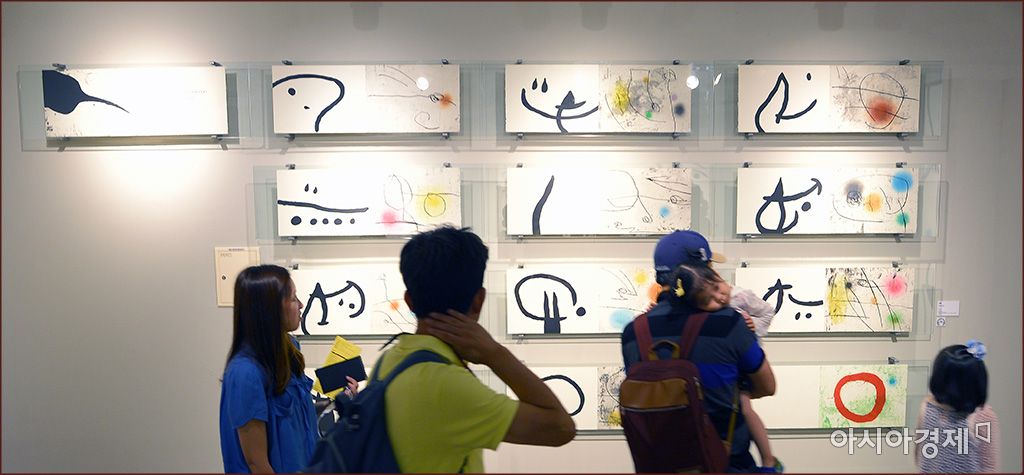 [아시아경제 윤동주 기자] 아시아경제 주최로 26일 서울 종로구 세종문화회관 미술관에서 개막한 '꿈을 그린 화가 호안 미로 특별전'을 찾은 관람객들이 작품을 둘려보고 있다. 호안 미로(Joan Miro, 1893~1983)’는 야수주의, 입체주의, 그리고 초현실주의에서 다양한 요소들을 받아들여 자신만의 개성 있는 양식을 만들어낸 화가로 스페인에서 가장 존경받는 화가로 이번 전시는 9월 24일까지 개최된다.윤동주 기자 doso7@asiae.co.kr<ⓒ세계를 보는 창 경제를 보는 눈, 아시아경제(www.asiae.co.kr) 무단전재 배포금지>