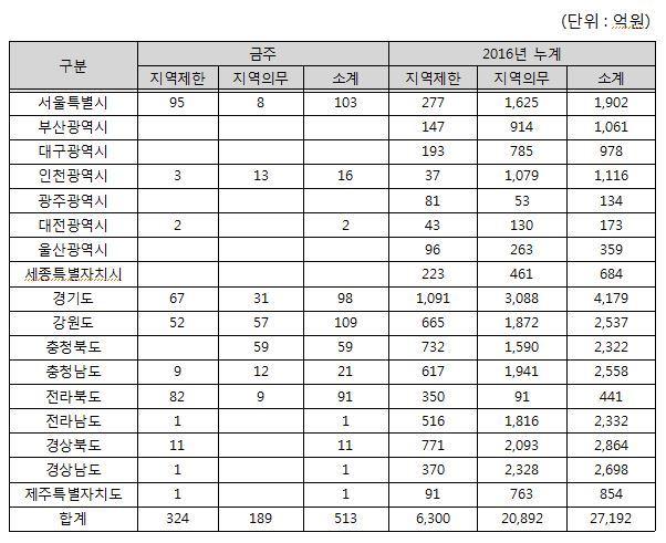 지역별 지역제한·지역의무공동도급 현황자료. 조달청 제공