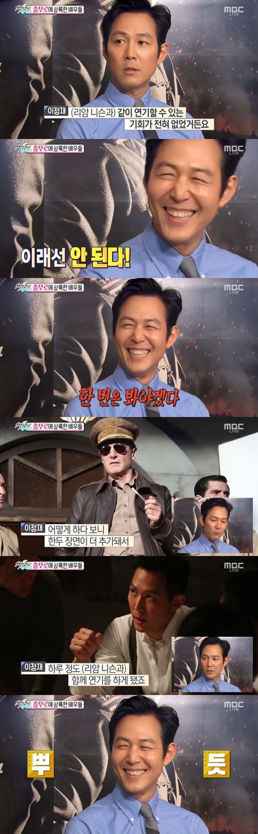 [아시아경제 김원유 인턴기자] 배우 이정재가 영화 '인천상륙작전'의 비하인드 스토리를 공개했다.26일 방송된 MBC 예능프로그램 '섹션TV연예통신'(이하 '섹션TV')에서는 이정재와 이범수, 진세연, 정준호의 영화 '인천상륙작전' 인터뷰가 전파를 탔다. 이날 방송에서 이정재는 "시나리오 상 리암 니슨과 만나는 장면이 없었다"며 "이건 안 된다 생각해 신을 추가해 연기를 함께 하게 됐다"고 말했다.이어 이정재는 "어떻게 하다 보니 한두 장면이 추가돼 하루 정도 함께 연기를 하게 됐다"고 말하며 기쁜 마음을 감추지 못해 보는 이들의 웃음을 자아냈다.한편 '섹션TV'는 매주 일요일 오후 3시 45분 MBC에서 방송된다.김원유 인턴기자 rladnjsdb@asiae.co.kr<ⓒ세계를 보는 창 경제를 보는 눈, 아시아경제(www.asiae.co.kr) 무단전재 배포금지>