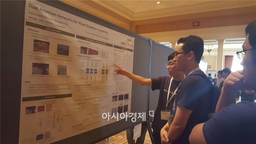[아시아경제 한진주 기자] 네이버의 기술 연구 센터인 네이버랩스가 인공지능 분야 국제대회에서 2위를 수상했다. 26일(현지시간) 네이버랩스는 미국 라스베이거스에서 열린 세계 최대 규모의 컴퓨터 비전·패턴 인식 학회인 ‘CVPR 2016(Computer Vision and Pattern Recognition)’의 ‘VQA(Visual Question Answering) 챌린지’ 부문에서 2위를 거뒀다. VQA 챌린지는 인공지능 분야의 첫 국제 대회로 CVPR 학회, 미국 정부와 글로벌 ICT 기업들이 후원했다. 네이버랩스의 인공지능 팀은 이미지와 관련된 질문으로부터 중요한 영역과 단어를 자동으로 추출하고, 정답을 추론하는 알고리즘 ‘DAN(Dual Attention Network)’으로 VQA 챌린지에서 우수한 성적을 거뒀다.VQA 과제는 문자로만 구성된 질문과 답의 범위를 넘어, 이미지를 보면 떠오르는 사람들의 많은 질문에 대해 꼭 맞는 답을 찾아내는 고난도의 기술을 요구한다. 이를 위해서는 이미지에 대한 이해, 인간의 자연스러운 언어 그리고 각각의 상관관계를 파악해 내는 첨단 인공지능 기술이 필요하다. VQA 챌린지는 지난해 10월부터 올해 6월까지 진행됐다. 페이스북, 메타마인드 등 글로벌 기업과 벤처를 비롯해 캘리포니아대(버클리), 동경대 등 국내외 유수 대학들이 참여했다. 최종 1위는 캘리포니아대(버클리), 2위는 네이버가 차지했다. 한진주 기자 truepearl@asiae.co.kr<ⓒ세계를 보는 창 경제를 보는 눈, 아시아경제(www.asiae.co.kr) 무단전재 배포금지>