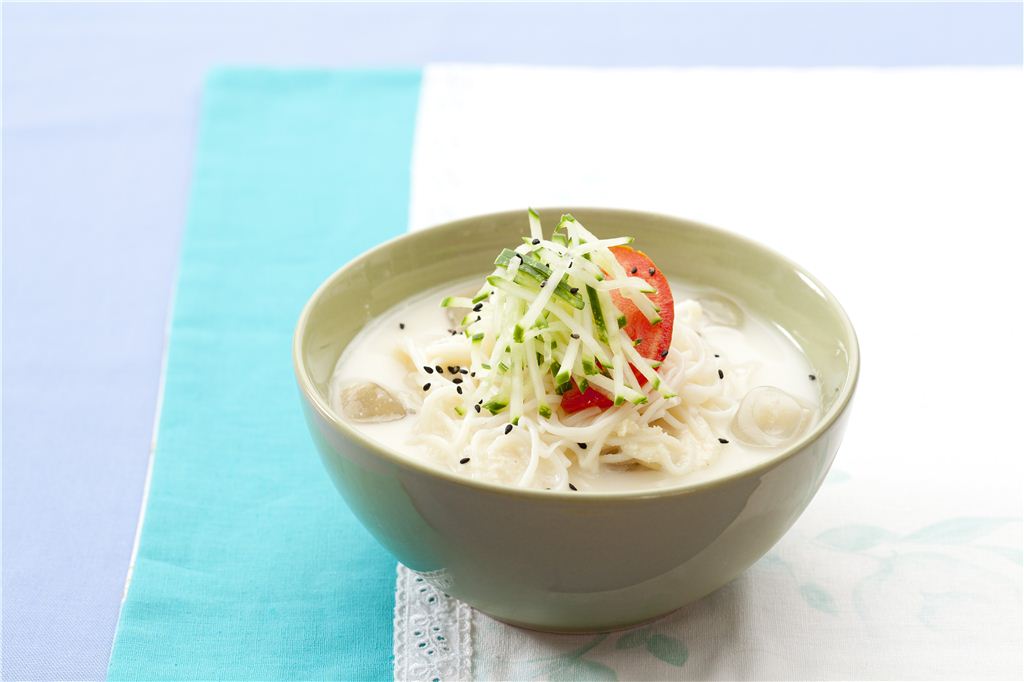흰콩, 메주콩이라고 부르는 대두로 콩국수를 만드는 것이 일반적이지만 껍질이 까만 서리태 콩이나 파릇파릇한 풋콩, 완두콩으로도 콩국수를 만들 수 있으며 콩에 깨나 잣, 땅콩을 약간 넣어 갈아주면 더 고소한 맛을 낼 수 있다. 곱게 채 썬 오이채를 듬뿍 올린 콩국수 한 그릇으로 시원하고 든든한 하루가 된다.