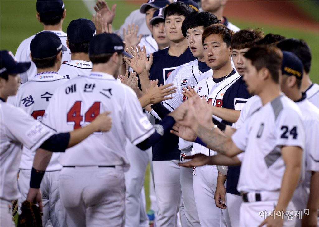 [아시아경제 김현민 기자]프로야구 NC 다이노스와 두산 베어스의 2016 KBO리그 경기가 28일 잠실구장에서 열렸다. 두산 선수들이 12-3 승리를 확정한 뒤 자축하고 있다. 김현민 기자 kimhyun81@asiae.co.kr<ⓒ세계를 보는 창 경제를 보는 눈, 아시아경제(www.asiae.co.kr) 무단전재 배포금지>