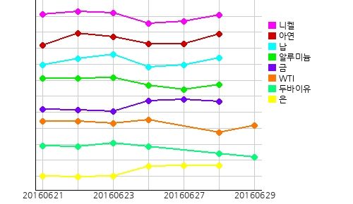 국제 원자재 시장에서 WTI(서부텍사스산원유)의 현물시세가 전일 대비 1.52 달러 오른 배럴당 47.85 달러를 기록했고, 두바이유 현물시세는 전일 대비 0.56 달러 떨어진 배럴당 44.55 달러를 기록했다.금 현물시세는 전일 대비 12.57 달러 떨어진 온스당 1311.88 달러를 기록했고, 반면 은 현물시세는 전일 대비 0.02 달러 오른 온스당 17.78 달러를 기록했다.주요광물시세는 니켈이 전일 대비 톤당 176 달러 올라 9135 달러를 기록했고 주석, 아연, 알루미늄, 납 모두 상승세를 보였다.환율