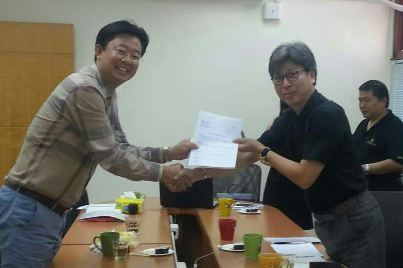 김범기 라디안 대표(왼쪽)가 대만 더마케어바이오메드 관계자와 수출계약서를 들어보이고 있다.[사진=라디안]
