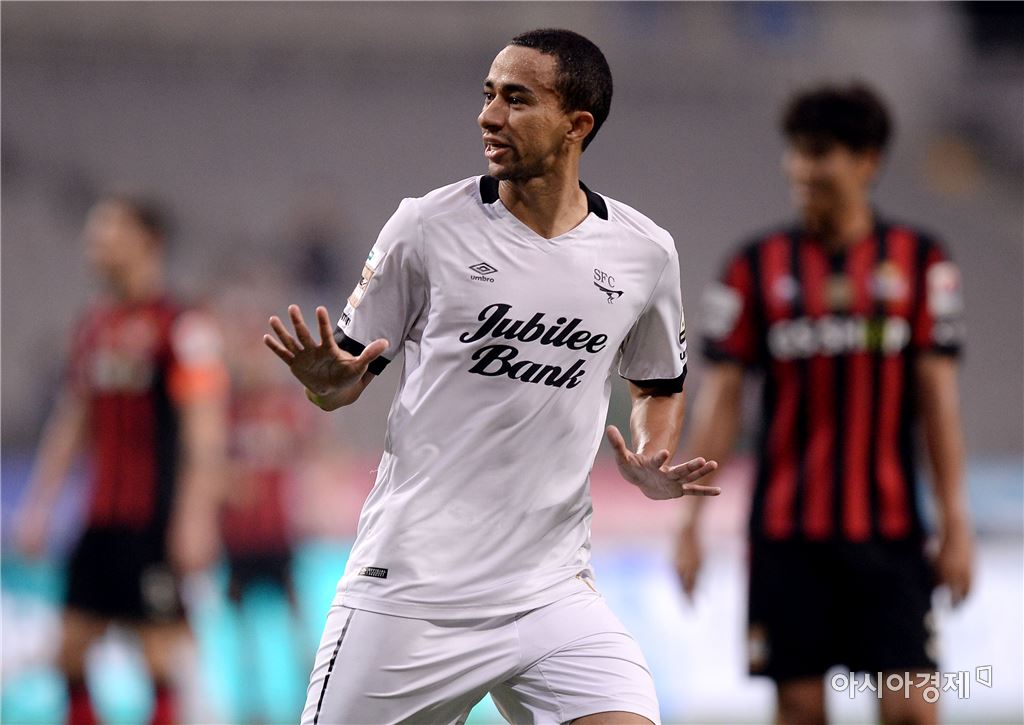 [아시아경제 김현민 기자] 프로축구 FC서울과 성남FC의 2016 K리그 클래식 경기가 29일 서울월드컵경기장에서 열렸다. 성남 티아고가 전반 동점골을 넣은 뒤 세리머니하고 있다. 김현민 기자 kimhyun81@asiae.co.kr<ⓒ세계를 보는 창 경제를 보는 눈, 아시아경제(www.asiae.co.kr) 무단전재 배포금지>