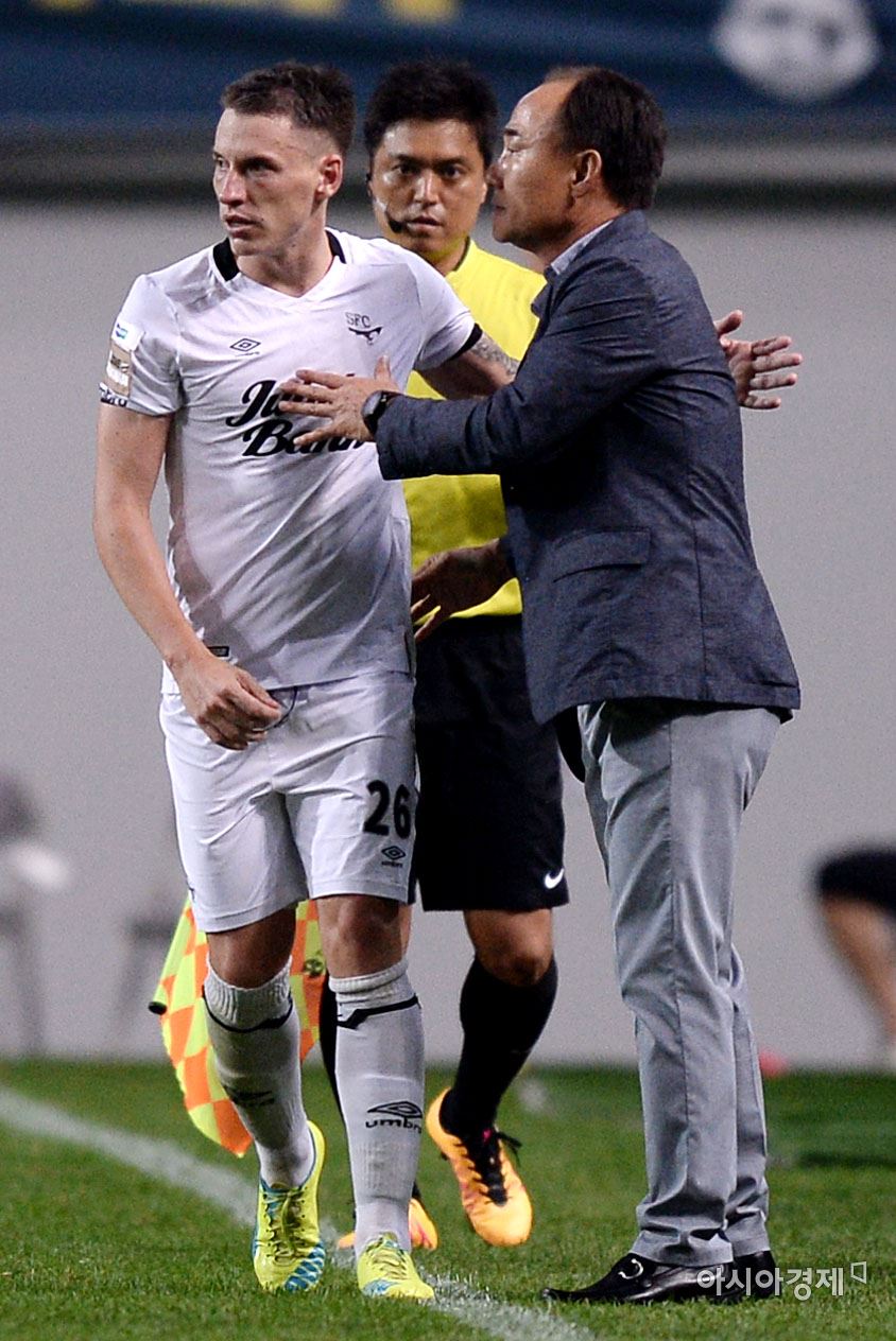 [아시아경제 김현민 기자] 프로축구 FC서울과 성남FC의 2016 K리그 클래식 경기가 29일 서울월드컵경기장에서 열렸다. 성남 피투가 후반 3-1 프리킥 추가골을 넣고 김학범 감독과 기뻐하고 있다. 김현민 기자 kimhyun81@asiae.co.kr<ⓒ세계를 보는 창 경제를 보는 눈, 아시아경제(www.asiae.co.kr) 무단전재 배포금지>