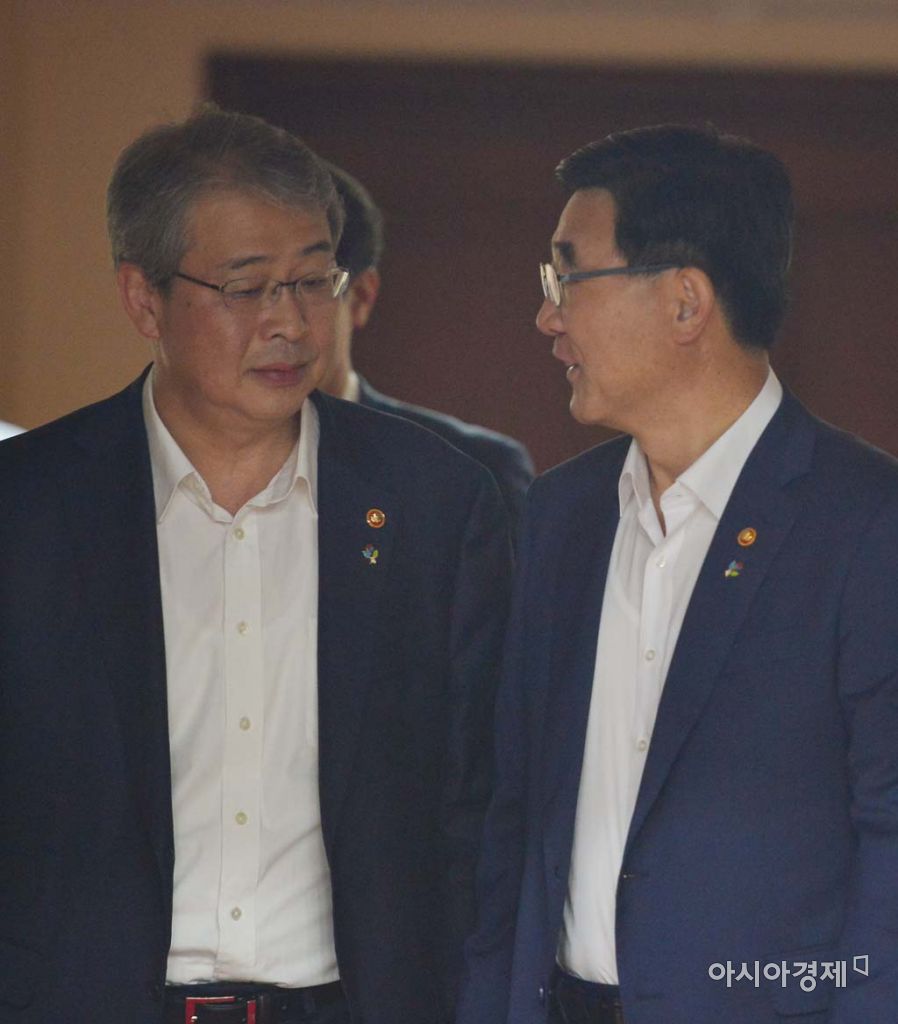 [아시아경제 백소아 기자] 임종룡 금융위원장(왼쪽)과 이기권 고용노동부 장관(오른쪽)이 30일 서울 세종로 정부서울청사에서 열린 산업경쟁력강화관계장관회의에 참석하기 위해 입장하고 있다.백소아 기자 sharp2046@asiae.co.kr<ⓒ세계를 보는 창 경제를 보는 눈, 아시아경제(www.asiae.co.kr) 무단전재 배포금지>