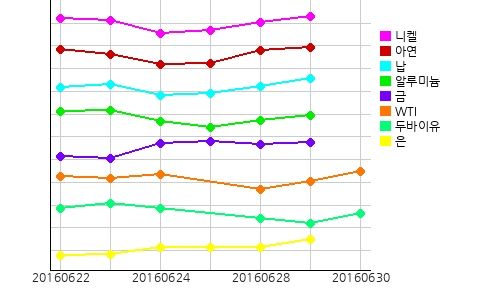 국제 원자재 시장에서 WTI(서부텍사스산원유)의 현물시세가 전일 대비 2.03 달러 오른 배럴당 49.88 달러를 기록했고, 두바이유 현물시세는 전일 대비 1.18 달러 오른 배럴당 45.73 달러를 기록했다.금 현물시세는 전일 대비 7.02 달러 오른 온스당 1318.9 달러를 기록했고, 은 현물시세도 전일 대비 0.52 달러 오른 온스당 18.3 달러를 기록했다.주요광물시세는 주석이 전일 대비 톤당 20 달러 떨어져 17046.5 달러를 기록하는 반면, 니켈이 전일 대비 톤당 139 달러 올라 9274 달러를 기록했고 납, 아연, 알루미늄 모두 상승세를 보였다.환율