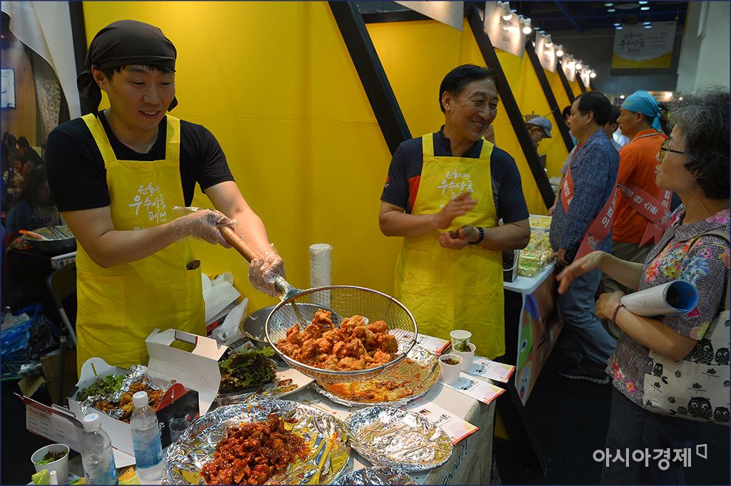 [아시아경제 윤동주 기자] 30일 서울 강남구 코엑스에서 열린 '전통시장 우수상품페어'를 찾은 관람객들이 전국 전통시장의 유명 음식을 시식하고 있다. 이마트가 소상공인시장진흥공단과 함께 전통시장 대표 상품을 발굴해 경연과 상품 홍보를 겸하는 박람회인 이번행사는 다음달 2일까지 계속된다.윤동주 기자 doso7@asiae.co.kr<ⓒ세계를 보는 창 경제를 보는 눈, 아시아경제(www.asiae.co.kr) 무단전재 배포금지>