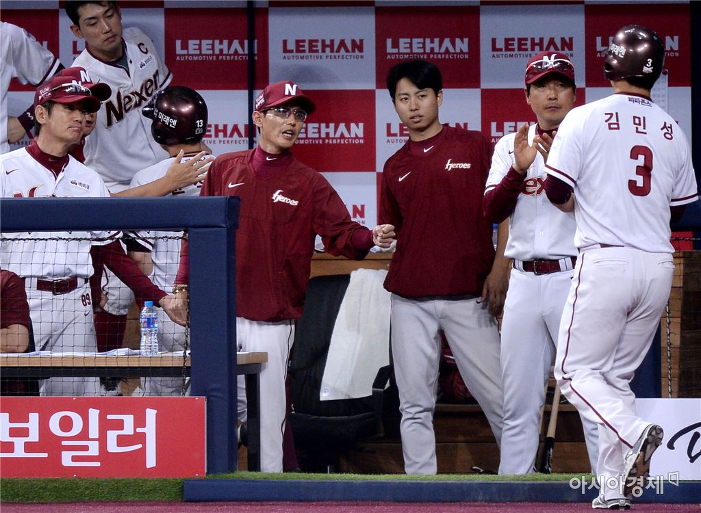 [아시아경제 김현민 기자] 프로야구 한화 이글스와 넥센 히어로즈의 2016 KBO리그 경기가 30일 서울 고척스카이돔에서 열렸다. 넥센 염경엽 감독이 3회말 1사 2,3루에서 넥센 이택근의 추가 2타점 2루타 때 득점을 올린 김민성과 하이파이브하고 있다. 김현민 기자 kimhyun81@asiae.co.kr<ⓒ세계를 보는 창 경제를 보는 눈, 아시아경제(www.asiae.co.kr) 무단전재 배포금지>
