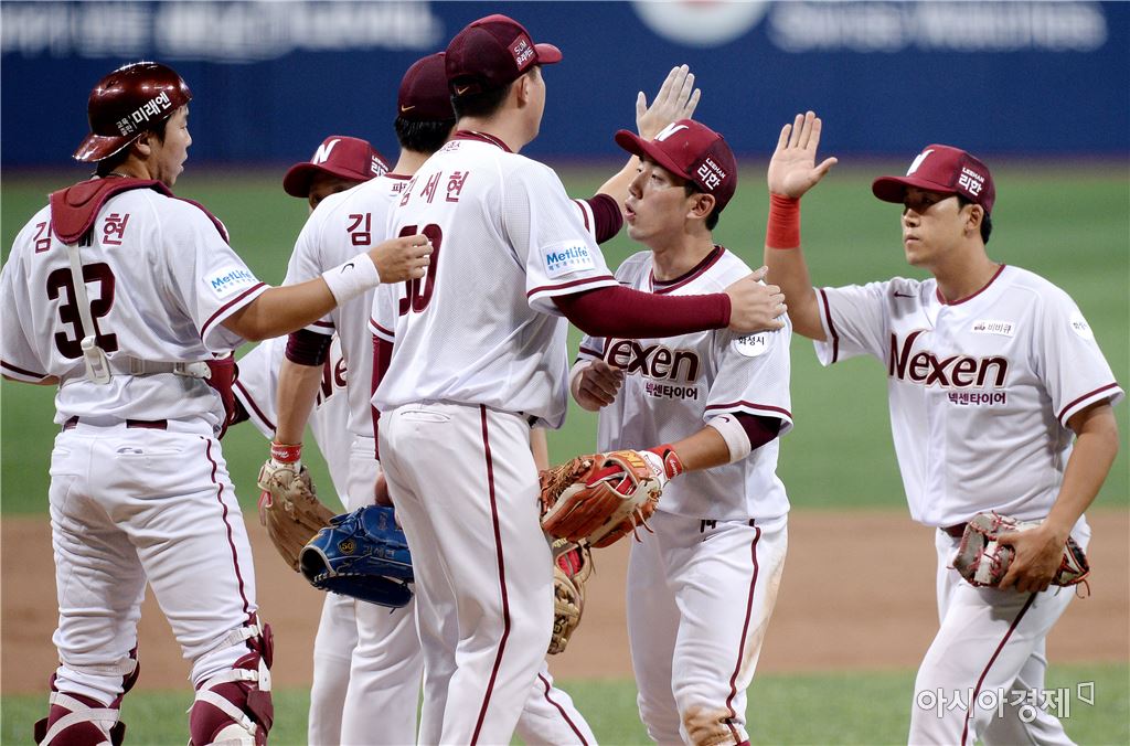 [아시아경제 김현민 기자] 프로야구 KIA 타이거즈와 넥센 히어로즈의 2016 KBO리그 경기가 1일 서울 고척스카이돔에서 열렸다. 넥센 선수들이 10-7 승리를 확정한 뒤 기쁨을 나누고 있다.김현민 기자 kimhyun81@asiae.co.kr<ⓒ세계를 보는 창 경제를 보는 눈, 아시아경제(www.asiae.co.kr) 무단전재 배포금지>