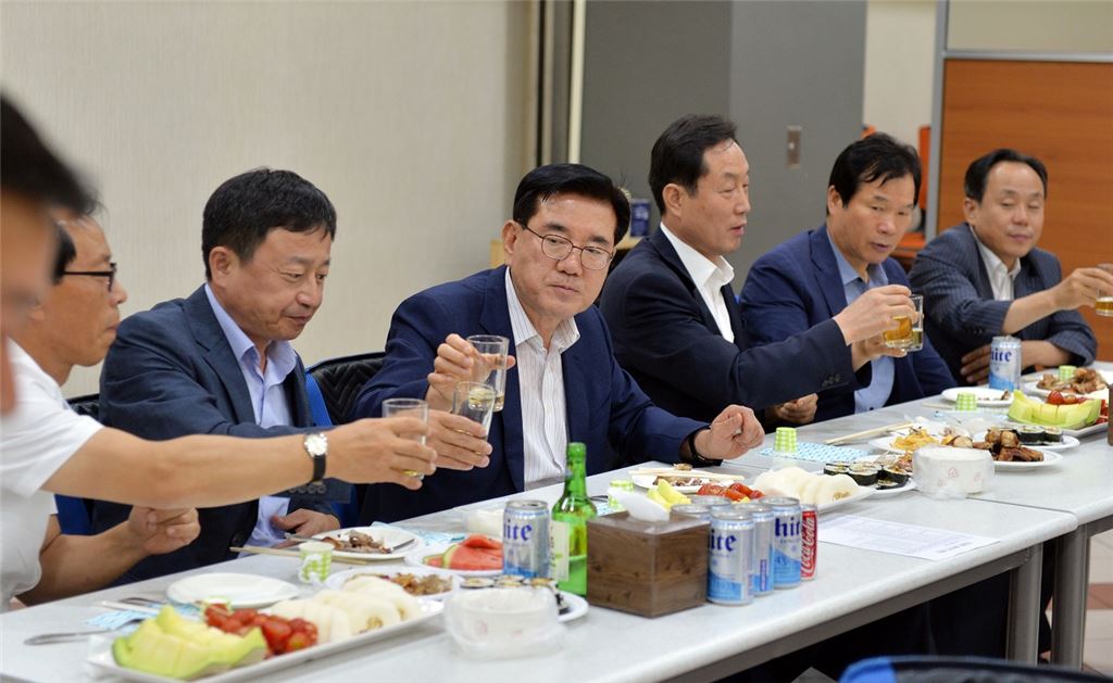 유덕열 동대문구청장이 회의 후 강병호 부구청장 등 간부들과 치맥을 먹으며 소통을 하고 있다.