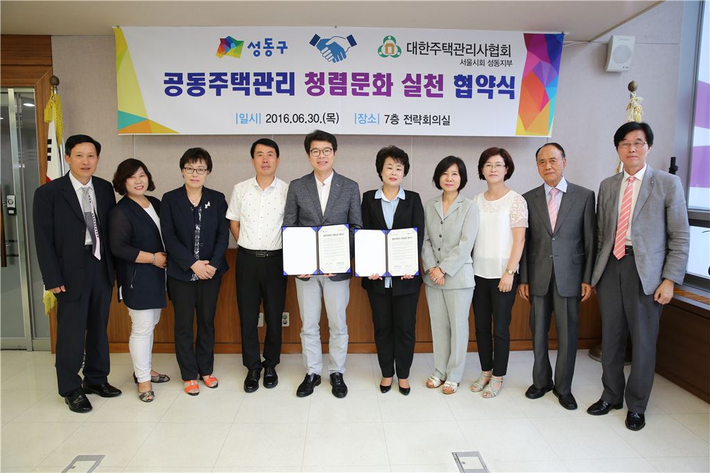 서울시 최초로 시행하는 ‘공동주택관리 청렴문화 실천협약’ 주요 내용은 ▲윤리성 및 전문성을 제고, 청렴하고 투명한 공동주택 관리문화 정착 ▲공동주택의 안전과 사고를 사전에 방지하기 위해 교육 및 홍보 등 예방에 필요한 조치를 적극적으로 전개 ▲청렴교육에 힘쓰고 ▲다양한 홍보방법을 통해 부정부패 예방 ▲구민이 신뢰하고 행복한 주거문화 정착 ▲모범적인 공동주택 관리문화가 실현되도록 적극협력 한다는 내용이다.이번 협약에 따라 구와 협회는 청렴하고 투명한 공동주택관리 청렴문화 정착을 위해 적극 노력, 안전사고 사전 예방 및 청렴교육을 하는 등 공동체 활성화로 모범적인 공동주택 관리문화 가치창조에 적극 협력하기로 했다.정원오 성동구청장은 “이번 공동주택관리 청렴문화 실천협약 체결로 주민이 신뢰할 수 있는 주거문화 정착과 공동체 활성화로 새로운 공동주택 관리문화 가치창조가 형성될 것으로 기대한다”고 밝혔다. 박종일 기자 dream@asiae.co.kr<ⓒ세계를 보는 창 경제를 보는 눈, 아시아경제(www.asiae.co.kr) 무단전재 배포금지>