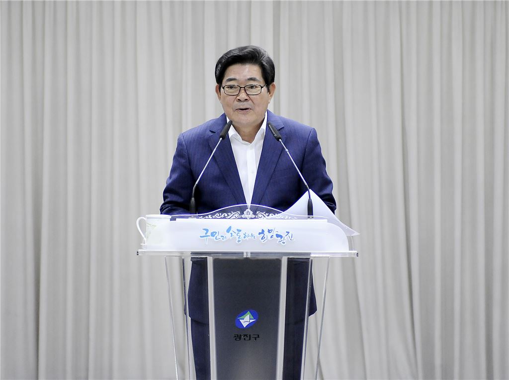 김기동 광진구청장이 지난 1일 민선6기 취임 2주년 정례조례를 열어 직원들에게 후반기 구정운영 방안을 밝히고 있다.