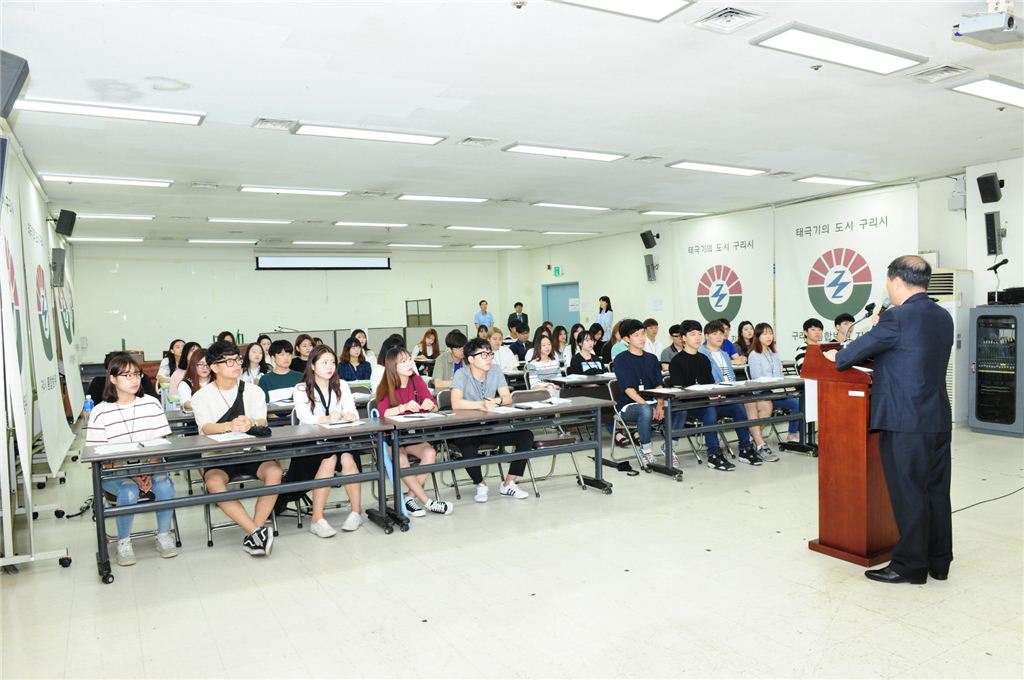 구리시의 대학생 시정체험 아르바이트 설명회에 참석한 학생들이 진지하게 설명을 듣고 있다.