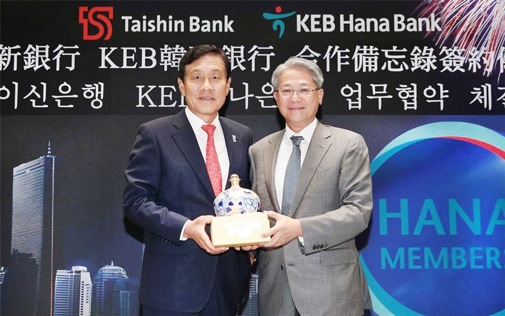 하나금융그룹은 지난 4일 오후 타이베이시 타이신금융그룹 본사에서 대만 주요 민영은행인 타이신국제상업은행과 전략적 업무제휴를 맺고 하나멤버스의 하나머니와 타이신은행의 포인트 교환을 통해 상호제휴처를 공동으로 이용하기로 합의했다. (왼쪽부터) 김정태 하나금융그룹 회장과 우동량 타이신금융그룹 회장이 업무제휴 체결후 기념사진 촬영을 하고 있다.(사진=하나금융그룹)