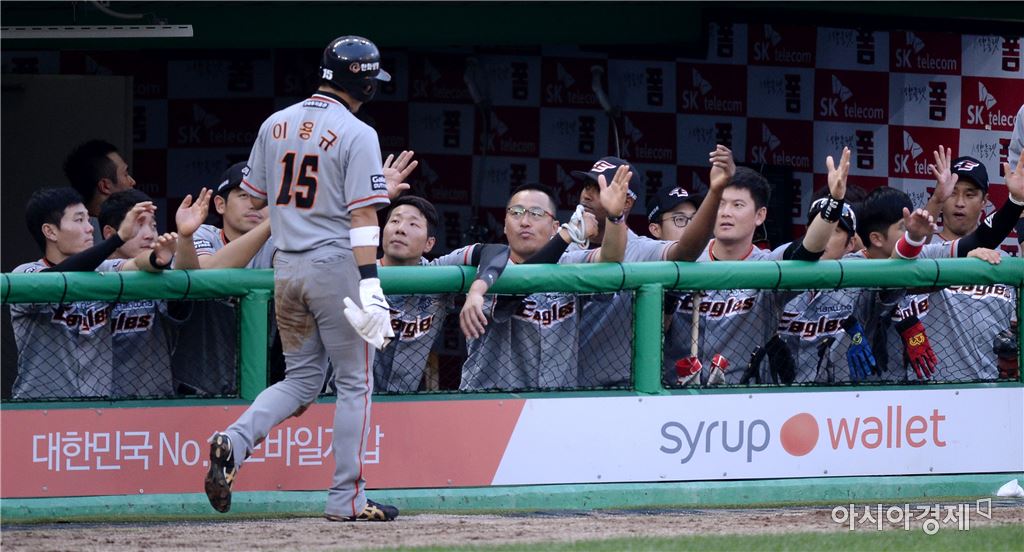 [문학=아시아경제 김현민 기자] 프로야구 한화 이글스와 SK 와이번스의 2016 KBO리그 경기가 6일 인천 문학구장에서 열렸다. 3회초 1사 3루에서 한화 송광민의 선취 1타점 내야안타 때 3루주자 이용규가 득점한 뒤 동료들과 하이파이브하고 있다. 김현민 기자 kimhyun81@asiae.co.kr<ⓒ세계를 보는 창 경제를 보는 눈, 아시아경제(www.asiae.co.kr) 무단전재 배포금지>