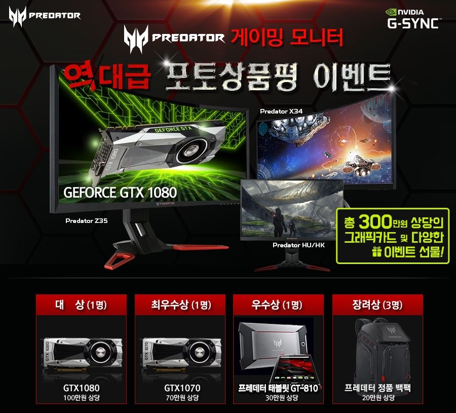 [아시아경제 김유리 기자] 에이서가 오는 31일까지 대규모 포토상품평 이벤트를 진행한다고 7일 밝혔다. 구매 일자에 관계없이 에이서의 지싱크(G-SYNC) 게이밍 모니터를 구매한 모든 구매자를 대상(에이서코리아 정품을 옥션에서 구매한 고객에 한함)으로 하며, 총 300만원 상당의 그래픽카드와 선물이 제공된다.이번 행사에 참여를 원하는 고객은 블로그나 커뮤니티 사이트에 포토상품평을 등록한 후 옥션에서 구매한 영수증을 캡처한 이미지와 등록한 상품평 URL주소를 이메일(nthan@atnd.co.kr)로 보내면 되며, 주최측으로부터 이벤트 참여신청완료 메일을 받으면 정상적으로 신청이 완료된다.이번 프로모션에 해당되는 제품은 '프레데터 Z35' '프레데터 X34' '프레데터 HU' '프레데터 HK'으로 그 중 프레데터 Z35는 최대 오버클러킹 200Hz까지 지원하는 국내 유일의 곡면형 게이밍 모니터로 21대 9의 울트라와이드 풀HD(2560×1080)해상도로 뛰어난 화질을 제공한다. 엔비디아 G 싱크를 통해 화면 잘림 현상을 해소하고 디스플레이 떨림 현상을 최소화했다.또한 35인치 커브드 디스플레이와 178도의 광시야각으로 역동적이고 왜곡 없는 선명한 화면을 제공하며, 엔비디아의 ULMB(Ultra Low Motion Blur) 기술이 탑재돼 레이싱 게임과 같은 빠른 움직임으로 인해 발생하는 모션 블로를 최소화한다.프레데터 X34은 엔비디아 지씽크가 지원되는 곡면형 게이밍 모니터로 34인치 커브드 디스플레이와 21대 9의 울트라 와이드 쿼드HD(3440×1440)해상도로 왜곡 없는 뛰어난 화질과 실감 넘치는 화면을 제공한다.포토상품평 이벤트 당첨자 발표는 다음 달 16일 당첨자 이메일로 개별 공지된다. 선정된 고객 중 대상(1명)에게는 100만원 상당의 GTX 1080 그래픽카드가, 최우수상(1명)에게는 70만원 상당의 GTX 1070 그래픽카드가, 우수상(1명)에게는 30만원 상당의 태블릿 프레데터 8이 각각 증정된다. 장려상(5명)에게는 20만원 상당의 프레데터 백팩이 제공된다.자세한 내용은 에이서 공식 판매처인 에이티앤디로 문의하면 된다.김유리 기자 yr61@asiae.co.kr<ⓒ세계를 보는 창 경제를 보는 눈, 아시아경제(www.asiae.co.kr) 무단전재 배포금지>