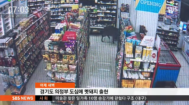 [아시아경제 한동우 인턴기자] 7일 새벽 경기도 의정부에서 멧돼지 한 마리가 편의점과 식당을 덮쳤다.농작물 수확을 앞둔 요즘, 먹을 게 떨어진 멧돼지가 자주 도심으로 내려오는 시기다. 멧돼지 한 마리가 편의점 유리창을 뚫고 들어와 10초 정도 편의점 안을 서성였다. 그 후 곧바로 뛰어 들어간 곳은 감자탕 집. 영업 중이던 식당은 순식간에 아수라장이 됐다.놀란 손님들은 탁자 위로 몸을 피하는가 하면 서둘러 식당 밖으로 빠져나갔다.몇몇 시민이 멧돼지를 식당용 카트로 몰았고 경찰도 출동했지만 멧돼지는 금방 식당을 빠져나와 근처 야산으로 달아났다.다행히 이번 소동으로 다친 사람은 없었다.경찰은 요즘 같은 시기에 멧돼지가 먹이를 찾으러 산에서 내려오는 경우가 흔하다며 주의를 당부했다.한동우 인턴기자 corydong@asiae.co.kr<ⓒ세계를 보는 창 경제를 보는 눈, 아시아경제(www.asiae.co.kr) 무단전재 배포금지>