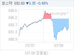 2016년 07월 08일 코스닥 지수는 3.35p (0.48%) 하락한 692.60로 마감했습니다.금일 (2시40분 기준) 코스닥 주요 상승 종목은 영신금속,빅텍,나이벡이며, 코스닥 주요 하락 종목은 삼화네트웍스,모바일리더,에스티큐브입니다.아경봇 기자 r2@asiae.co.kr<ⓒ세계를 보는 창 경제를 보는 눈, 아시아경제(www.asiae.co.kr) 무단전재 배포금지>