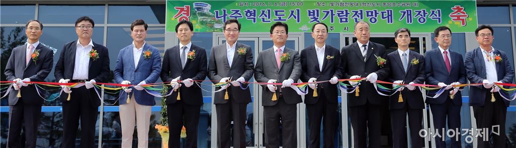 [아시아경제 노해섭 기자]광주ㆍ전남공동혁신도시의 랜드마크 될 ‘빛가람전망대(높이20.7m)’ 개장식이 8일 오후 중앙호수공원 내 배매산에서 열린 가운데 이낙연 전남지사, 우범기 광주시 경제부시장, 강인규 나주시장, 손금주 국회의원, 이주민 대표 등 참석자들이 테이프를 자르고 있다. 전망대는 홍보관과 기념관, 전시관, 북카페, 레스토랑, 모노레일, 돌미끄럼틀 등 주요시설을 갖추고 있다. 탑승료 1000원을 내면 18인승 전동식 모노레일을 왕복으로 이용할 수 있다.