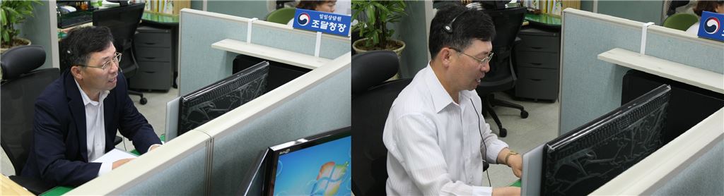 정부조달콜센터에서 일일 상담사를 자처한 정양호 조달청장. 야심차게 체험을 시작한(좌) 정 청장이 업무상 긴장감으로 허리를 꼿꼿히 세우고 팔을 걷어 붙이며 상담에 임하고 있다(우). 조달청 제공