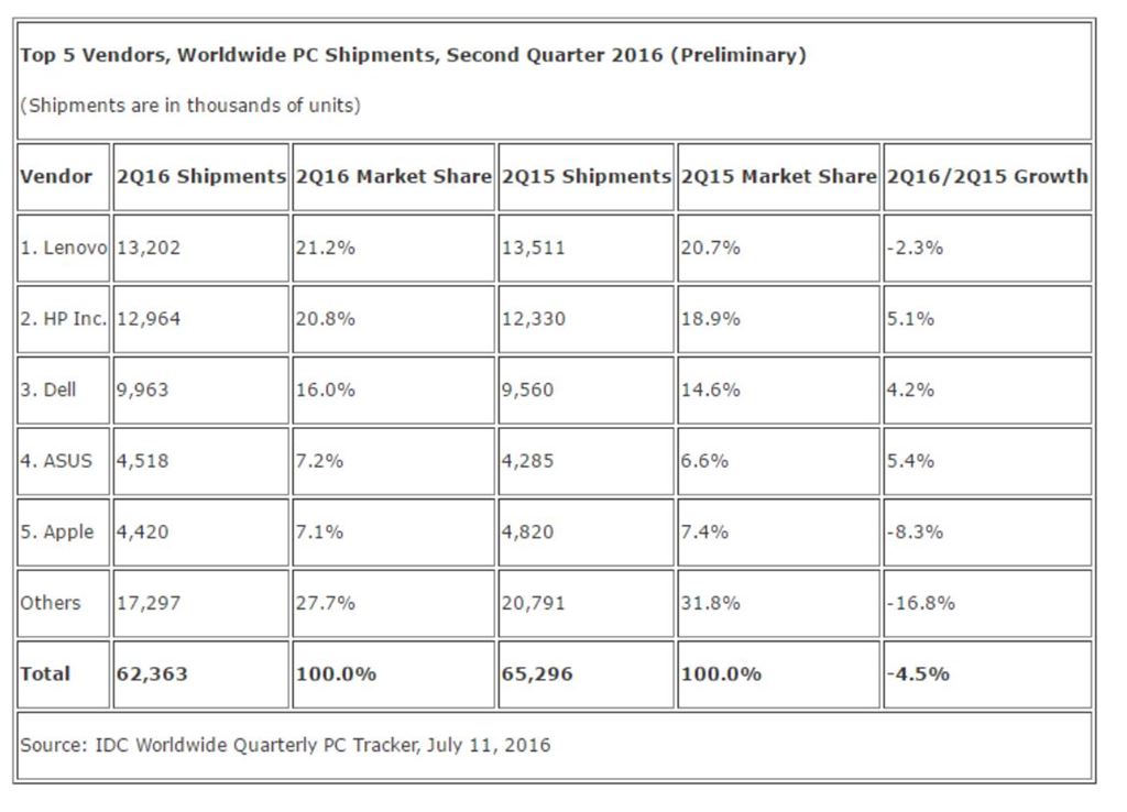 [아시아경제 한진주 기자] 글로벌 PC 시장이 회복될 기미가 보이지 않는다. 시장조사기관들도 일제히 글로벌 PC 출하량이 또 감소했다고 지적했다. 11일(현지시간) 벤처비트는 시장조사기관 가트너를 인용해 2분기 PC 출하량이 6430만대를 기록해 지난해보다 5.2% 감소했다고 밝혔다. 7분기 연속 성장률이 감소했다.다만 북아메리카 지역에서는 5분기만에 처음으로 PC생산량이 증가했다.상위 6개 제조사의 2분기 출하량은 ▲레노버 1319만대 ▲HP 1228만대 ▲델 978만대 ▲에이수스 469만대 ▲애플 455만대 ▲에이서 441만대로 집계됐다. 6곳 중에서 레노버와 애플만 PC 출하량이 감소했다. 6개 업체를 제외한 기타 업체들의 성장률은 19.1%나 줄었다.2분기 PC 출하량 (출처 = IDC)