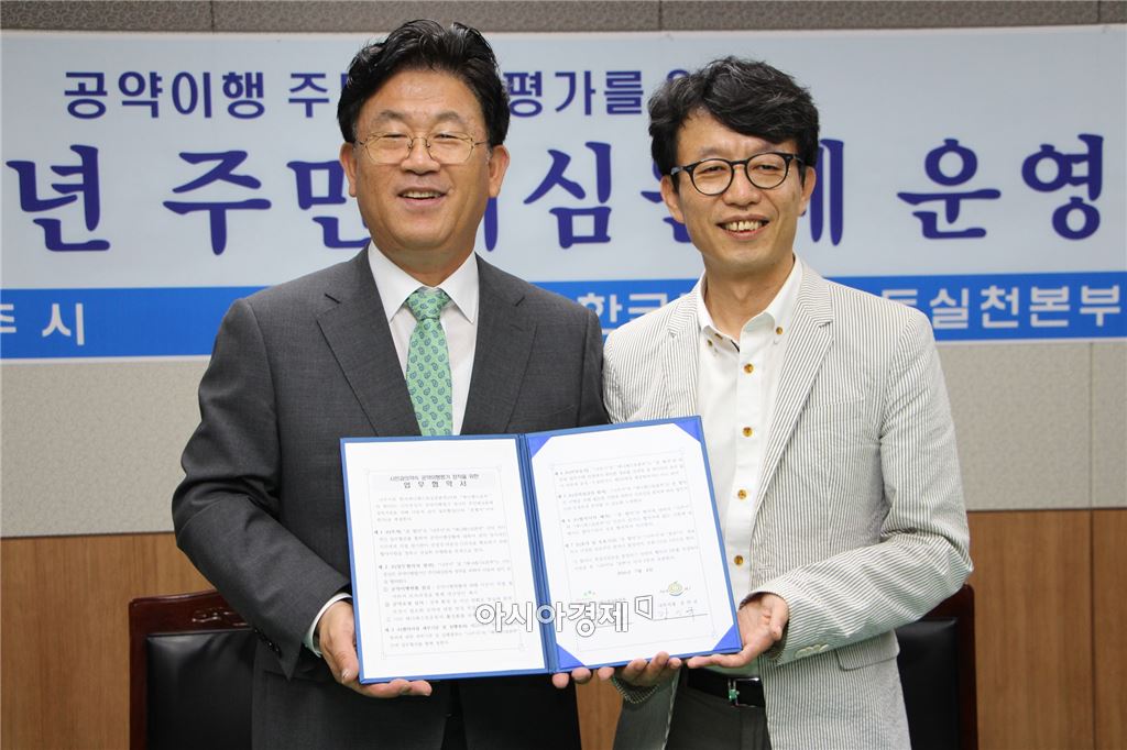 한국매니페스토실천본부와 맺은 주민 배심원제 업무협약과, 노인 목욕료 및 이·미용비 지원 업무 협약을 체결하고 기념촬영을 하고 있다. 사진=나주시