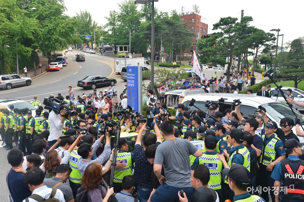 [아시아경제 문호남 인턴기자] 일본 자위대 창설 62주년 기념 행사가 있는 12일 서울 중구 밀레니엄힐튼 호텔 앞이 일본 자위대 창설 기념행사를 반대하는 시민단체와 경찰, 취재진으로 북적이고 있다.문호남 인턴기자 munonam@asiae.co.kr<ⓒ세계를 보는 창 경제를 보는 눈, 아시아경제(www.asiae.co.kr) 무단전재 배포금지>