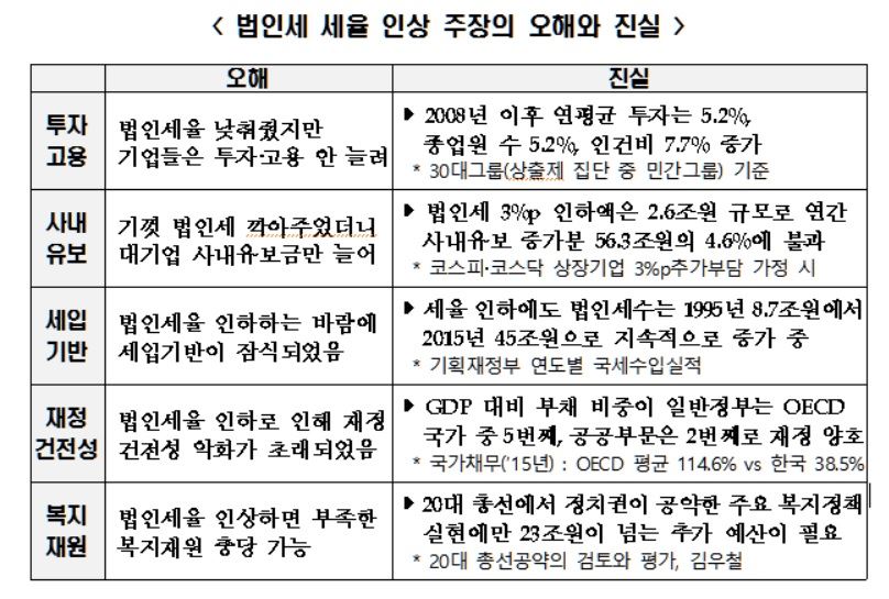 [아시아경제 심나영 기자]전국경제인연합회가 법인세 인상 주장 근거에 오해가 있다는 주장을 13일 내놓았다. 정치권을 중심으로 법인세 인상을 요구하는 목소리가 높아지면서 나온 조치다. 경제위기 극복을 위해서는 법인세 인하를 포함한 기업 투자 지원책이 필요하다고 지적했다. 2009년 법인세 인하에도 기업들이 투자와 고용에 소극적이라는 오해와 달리 세계적인 경제침체 속 30대그룹의 투자와 종업원 수는 연평균 5.2% 늘어난 것으로 나타났다. 인건비 역시 연평균 7.7% 증가했다. 같은 기간 동안 연평균 경제성장률 3.1%, 전국 취업자 수 증가율 1.4%, 소비자물가지수 증가율 2.2%와 비교해 보면 주요 기업들의 투자·고용 실적은 고무적이다.전경련은 법인세 인하로 대기업의 사내유보 자산만 늘었다는 주장에 대해서도 반박했다. 사내유보 자산과 법인세는 직접적인 연관성이 떨어진다고 것이다. 사내유보 자산은 80% 이상이 설비·재고 등의 형태로 투자된 자산이다. 법인세 인하는 기업들의 실적 개선과 투자 확대의 이끌어 낼 뿐 규모면에서 보면 사내유보 증가분의 4.6%에 불과하다고 밝혔다. 법인세 인하로 세입 기반이 잠식됐다는 주장에 대해서도 지적했다. 지난 20년간 법인세율 인하가 기업 실적 개선으로 이어지면서 법인세수는 꾸준히 늘어났다는 것이다. 법인세 인하로 인한 재정건전성 악화 주장에 대해서도 현재 우리나라의 재정건전성은 세계 최고 수준이며, 미래에 대한 악화 우려는 세출 개혁과 경제 활성화를 통해 극복해야할 과제라고 주장했다. 법인세 인상으로 복지재원을 충당하겠다는 주장에 대해서도 반대했다. 저출산·고령화로 급증하는 복지비용을 땜질식 징세로는 감당할 수 없다고 반박했다. 기초연금제도를 현재 수준으로만 유지해도 2040년에는 100조원이 소요되며 지난 총선에서 정치권이 제시한 주요 복지 공약 실현에도 22조7000억원이 추가로 필요한 상황이다. 법인세 인상(과세표준 500억원 이상 대상, 3%포인트 인상 시)으로 징수 가능한 금액은 3조원대에 불과하다고 밝혔다. 송원근 전경련 경제본부장은 “선진국 뿐만 아니라 세계 각국이 법인세 인하를 통해 자국기업의 경쟁력을 확보하고 외국기업 유치를 위해 노력하고 있는 상황”이라며, “우리만 법인세를 올린다면 글로벌 경제전쟁 최일선에서 싸우고 있는 대표 기업들의 경쟁력을 떨어뜨리고, 당면한 경제위기 극복 노력에도 찬물을 끼얹는 결과를 초래할 것”이라고 우려했다.심나영 기자 sny@asiae.co.kr<ⓒ세계를 보는 창 경제를 보는 눈, 아시아경제(www.asiae.co.kr) 무단전재 배포금지>