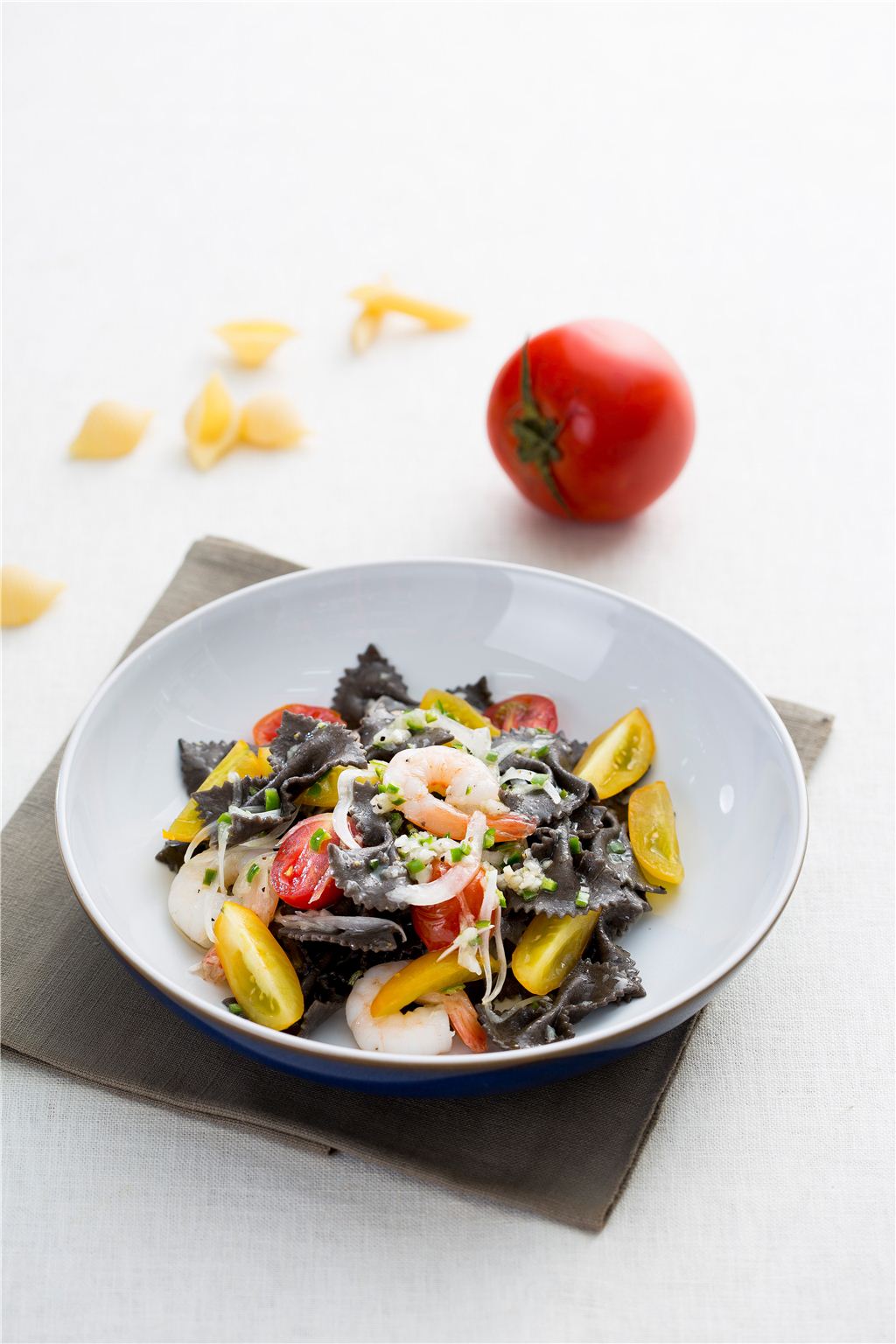 4. 볼에 삶은 파팔레를 넣고 소스를 넣어 버무린 다음 새우, 방울토마토, 양파를 넣어 섞고 실파를 뿌린다.