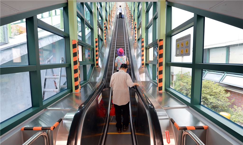 동대문구 주민들이 신이문역 3번 출구에 새로 설치된 에스컬레이터를 이용하고 있다.<br /> <br />