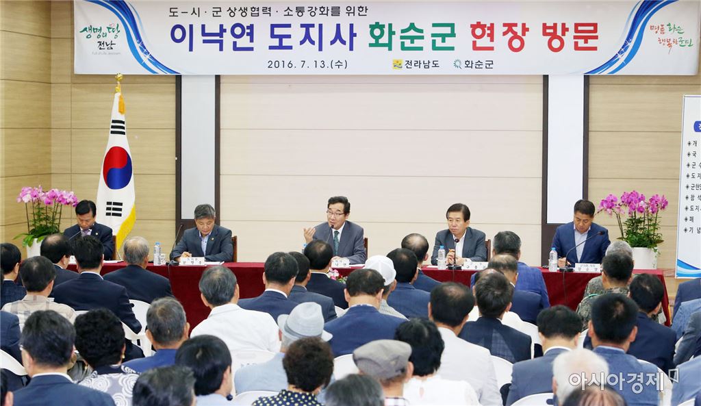 "13일 화순서 도민과 현장대화…군도 16호선 확포장 등 지원 약속"[아시아경제 노해섭 기자]이낙연 전라남도지사는 13일 “화순은 세상이 아는 것보다 훨씬 더 많은 자산을 가진 곳이자, 전남의 미래산업 네 가지 중 하나인 생물의약산업의 중심지다”고 평했다.이 지사는 이날 화순군 능주복지회관에서 구충곤 군수와 문행주, 민병흥 전남도의회 의원, 강순팔 화순군의회 의장, 군민 등 150여 명과 현장 대화의 시간을 갖고 이같이 언급했다.이 지사는 특히 “화순전남대병원이 있는 것을 비롯해 전대 의대 자체가 화순으로 이전하고 있고 대한민국 최고의 제약회사인 녹십자의 가장 큰 생산라인이 있다”며 “또한 화순은 우수 한약재 유통의 중심지여서 통합의학·생물의학분야의 견인차가 되고 있다”고 화순의 발전 비전을 시사했다.이어 이 지사는 “화순은 적벽과 운주사를 포함한 가장 개성이 풍부한 관광자원을 갖고 있는 곳이다”며 “이런 여건을 잘 가꾸고, 그동안 척박한 환경에서 삶을 일구어 온 군민들의 열정이 모아진다면 훨씬 큰 기적을 이룰 수 있을 것”이라고 말했다. 화순군이 건의한 ‘백신글로벌산업화 기반구축사업’에 대해선 “최근 기재부를 방문, 예산실장과 담당 국장을 만나 전남이 중요시하는 사업임을 강조했고 지난해 예비타당성조사도 통과한 만큼 국비 반영이 될 것”이라고 답했다.‘군도 16호선인 이천∼서유 간 확포장 공사’와 관련해선 “군의 어려운 재정 형편을 감안하고, 주변 관광지 도로 이용자의 편의를 위해 도 차원의 지원을 적극 검토하겠다”고 밝혔다. 또 ‘중국인 관광자원 주자묘 기반정비’와 ‘정율성 유적지 조성사업’에 대해선 “올해 5억 2천만 원을 지원했고, 내년 주자묘 6억 원과 정율성 유적지 3억 원을 이미 지특에 반영해 중앙정부에 요청해 둔 상태로, 중앙정부에서 승인해줄 것으로 기대한다”고 말했다.주민들의 ‘오도제 수리시설 개보수 사업비 지원 건의’와 관련해서는 “오도제는 안전등급상 C등급으로 분류돼 있다”며 “화순군 내 D등급 저수지가 11군데나 되므로 D등급을 먼저 수리한 후 오도제의 시급성을 따져 개보수 추진을 검토하겠다”고 이해를 구했다.이 지사는 이밖에 ‘생물의약산업단지 내 기업 유치 지원’과 ‘화순읍∼남평 구간 확포장공사 조기 완공’, ‘지방하천 춘양천 정비사업 지원’, ‘한국전력 관련 이전기업 화순 유치 지원’등 건의에 대해 “도 차원의 다양한 해법을 찾겠다”고 답했다.이 지사는 현장대화에 이어 내수면양식·수산식품단지 조성지 현장을 방문해 현황을 듣고 관계자들을 격려했다.한편 화순군은 이날 ‘화순적벽 관광투어 운영’과 '100원 효도택시 확대 운영’을 우수 시책 추진사업으로 보고했다.노해섭 기자 nogary@<ⓒ세계를 보는 창 경제를 보는 눈, 아시아경제(www.asiae.co.kr) 무단전재 배포금지>