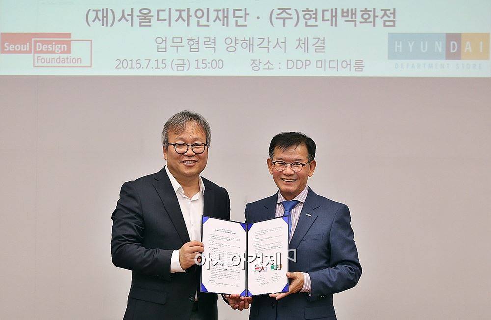 [아시아경제 김현정 기자] 현대백화점은 서울디자인재단과 '패션·공예·디자인 산업 활성화'를 위한 업무협약을 체결했다. 협약식은 15일 오후 3시 서울시 종로구에 있는 동대문 디자인 플라자 2층 미디어룸에서 김영태 현대백화점 사장(사진 오른쪽), 이근 서울디자인재단 대표가 참석한 가운데 진행됐다. 김현정 기자 alphag@asiae.co.kr<ⓒ세계를 보는 창 경제를 보는 눈, 아시아경제(www.asiae.co.kr) 무단전재 배포금지>