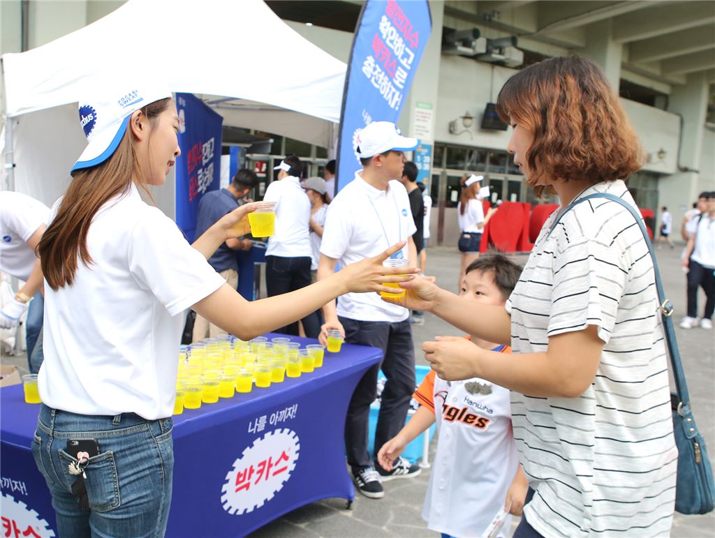 <br /> <br /> 지난 14일 잠실야구장에서 진행된 동아제약 박카스 샘플링 행사에서 야구장을 찾은 사람들에게 컵에 박카스와 얼음을 넣어 나눠주고 있다.<br /> <br /> <br />