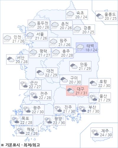 현재 기온이 가장 낮은 곳은 태백으로 영상 19도이며, 제주는 영상 24도로 가장 높은 기온을 기록하고 있고, 아침 최저기온은 영상 18도에서 영상 24도, 낮 최고기온은 영상 24도에서 영상 31도가 되겠습니다.미세먼지 농도: 오전 전남·경남·제주 지방은 ‘보통’ 입니다.※ 미세먼지 자료는 인증되지 않은 실시간 자료이므로 오차가 발생할수 있음.아경봇 기자 r2@asiae.co.kr<ⓒ세계를 보는 창 경제를 보는 눈, 아시아경제(www.asiae.co.kr) 무단전재 배포금지>