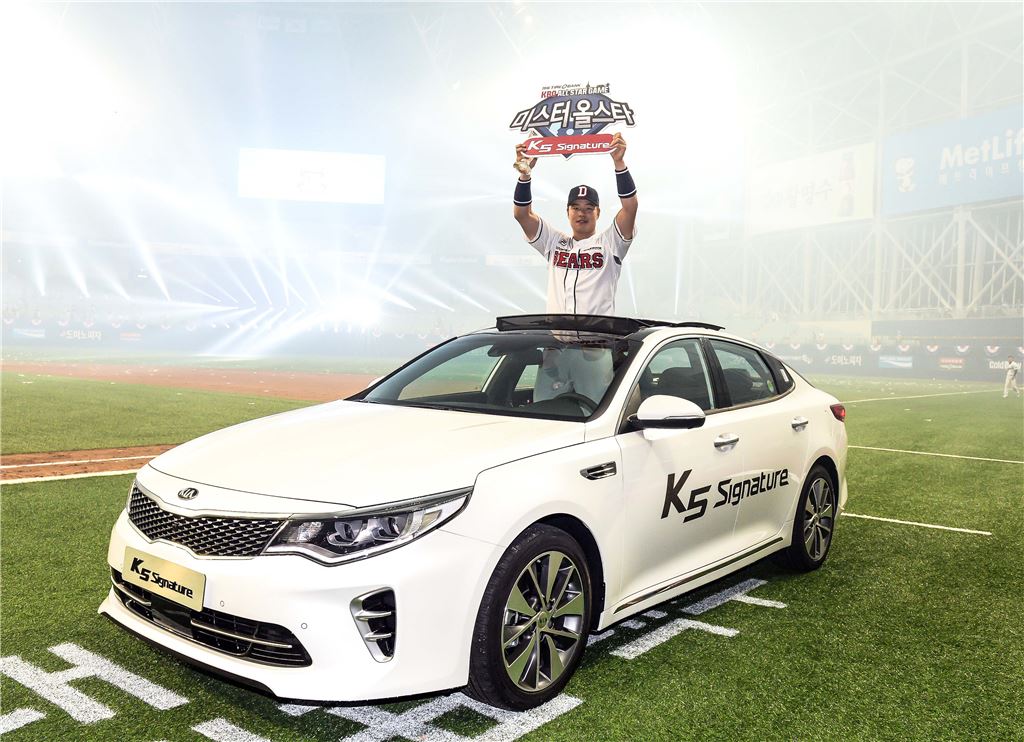 미스터 올스타 민병헌 선수가 '2017 K5 시그니처'를 타고 기념촬영을 하고 있다.